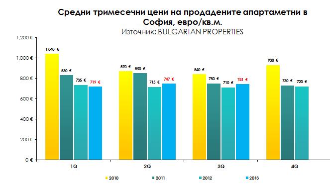 В София цените се движат между 720 и 750 евро през последните 1-2 години. Нашите данни за 3-тото тримесечие сочат, че средната цена на сключените сделки е била 741 евро/кв.м. (при 747 евро/кв.м. през 2-рото тримесечие и 710 евро/кв.м. за 3-тото тримесечие на 2012 г.). Средната обща цена на закупените апартаменти в София е без съществено изменение и през изминалите месеци е 64 200 евро.