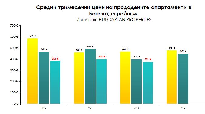 Средната цена на продадените апартаменти в Банско за третото тримесечие на 2013 г. по данни на BULGARIAN PROPERTIES e 375 евро на кв.м., което представлява спад от -6% спрямо второто тримесечие (400 евро/кв.м.) и спад на годишна база отново с -6%.