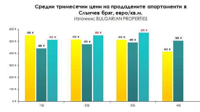 Средната цена на продадените апартаменти в Слънчев бряг за третото тримесечие по данни на BULGARIAN PROPERTIES е 570 евро на кв.м. спрямо 490 евро за същия период на 2012 г. и 550 евро за 2-рото тримесечие на 2013 г. Средната цена на закупените през 3-тото тримесечие апартаменти е 33 700 евро.