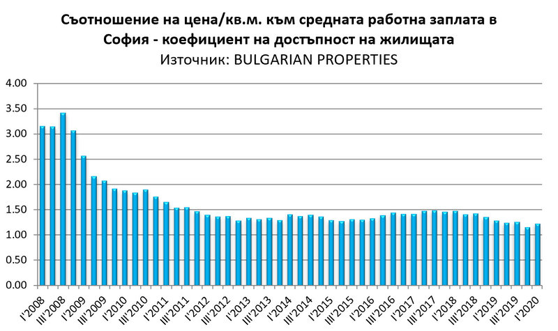 Въпреки растежa на цените на имотите през последните няколко години, коефициентът на достъпност (колко средни заплати са нужни, за да се купи 1 кв. м. жилище) се запазва устойчив и за София възлиза на 1.20 спрямо 3.43 през 2008 г.