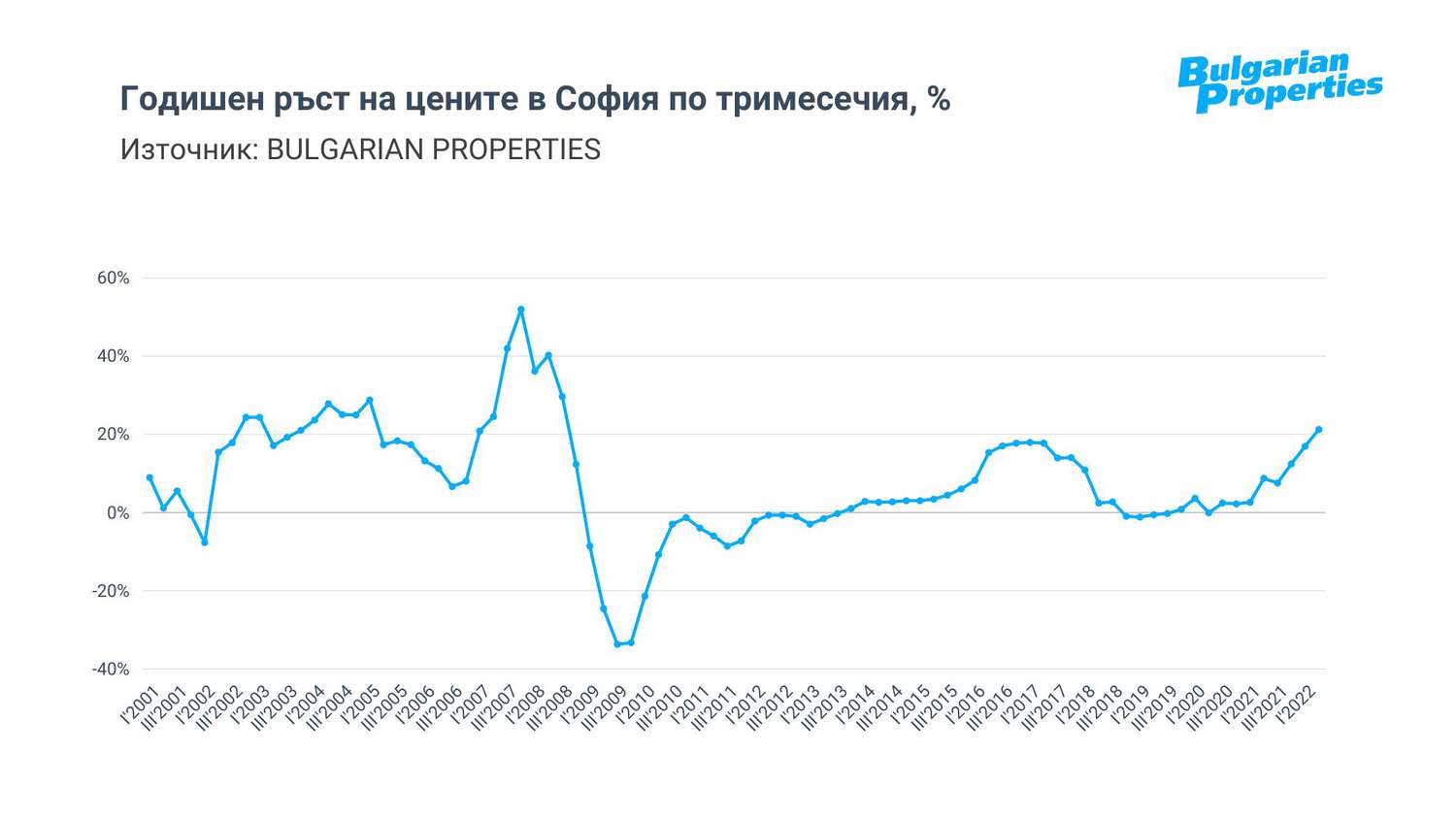 Всичко това доведе до ускоряващ се ръст на цените, който по данни на BULGARIAN PROPERTIES достигна 21% в София през второто тримесечие на 2022. Tова представлява най-бързото нарастване от 2008 г. насам.