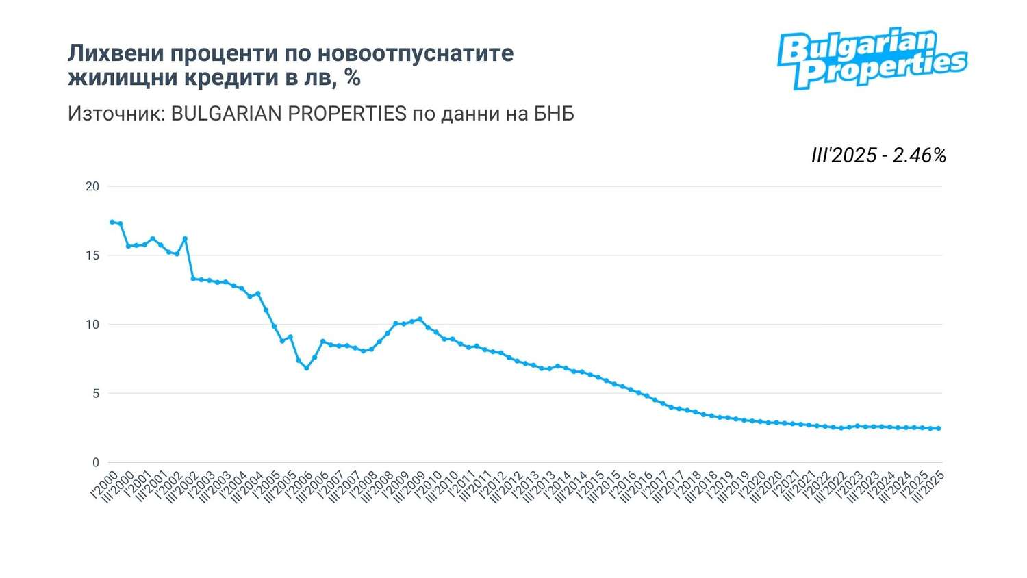 Данните на БНБ сочат, че средният лихвен процент по жилищните кредити продължава да се задържа на ниски нива и през третото тримесечие достига 2.46%.