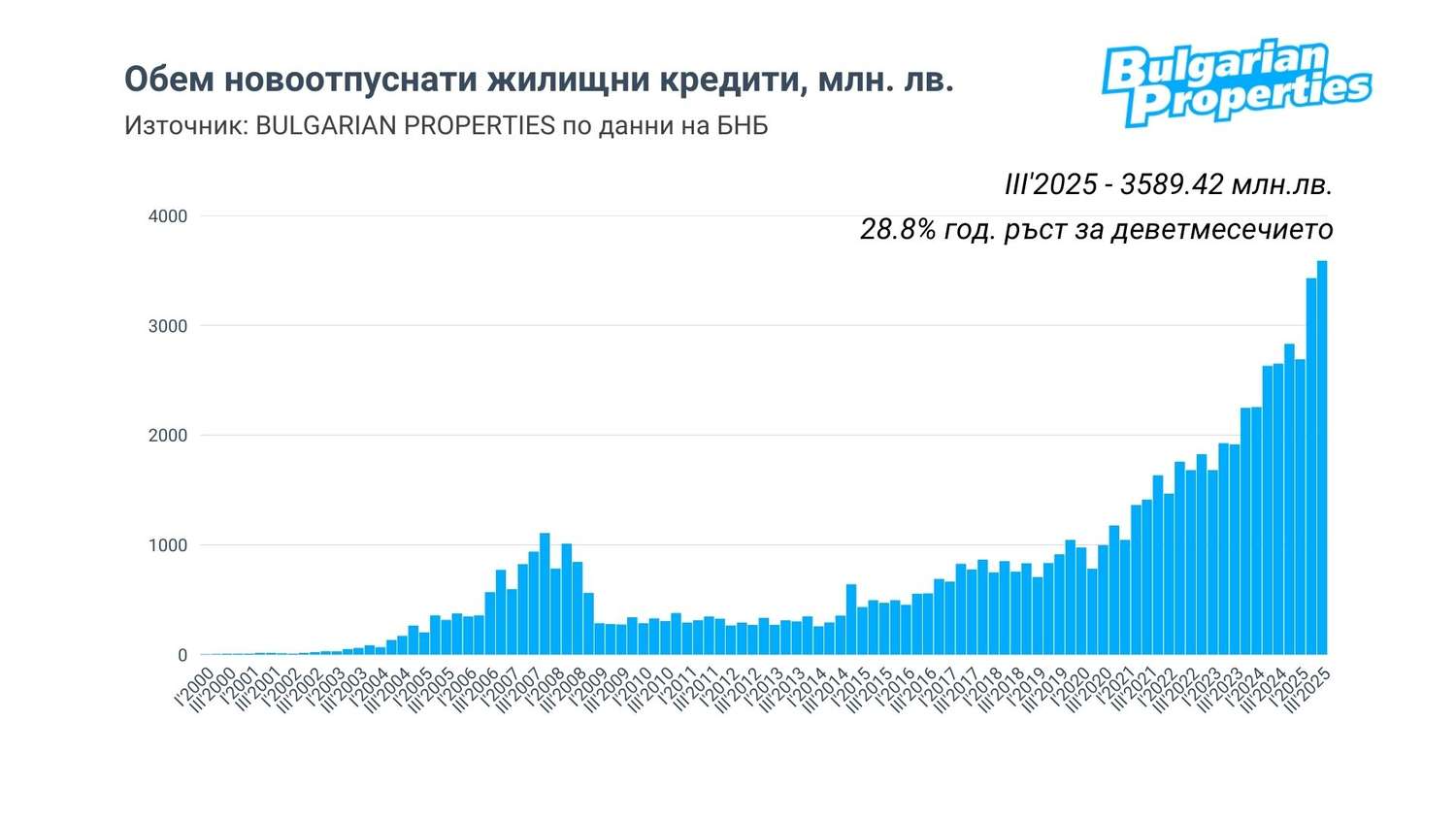 Същевременно, през цялата 2025 г. новоотпуснатите жилищни кредити бележат ръстове от около и над 30% на годишна база. Тенденция, която наблюдаваме за поредна година и която е един от факторите, заедно с растящите доходи и очакването на еврото, допринасящи за ускореното развитие на жилищния пазар.