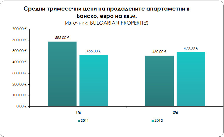 Средната офертна цена на апартаментите в Банско за второто тримесечие на 2012 г. по данни на BULGARIAN PROPERTIES e 574 евро на кв.м. (без изменение спрямо предходното тримесечие), а сделки се сключват на средна цена 490 евро на кв.м. (при 465 евро на кв.м. през първото тримесечие на 2012 г.)