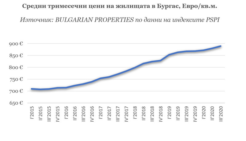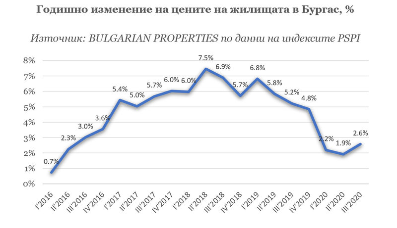 Данните от индексите PSPI показват, че през 2020 г. цените на жилищата в Бургас нарастват с по-бавен темп от предходните години.