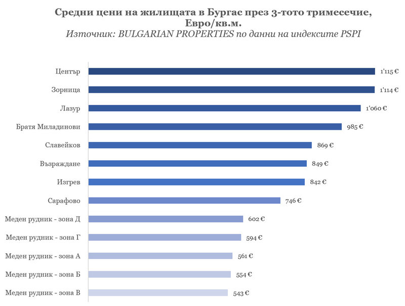 Най-скъпи квартали с цени над 1 000 евро/кв.м. са център, Зорница и Лазур, като веднага след тях се нарежда Братя Миладинови.