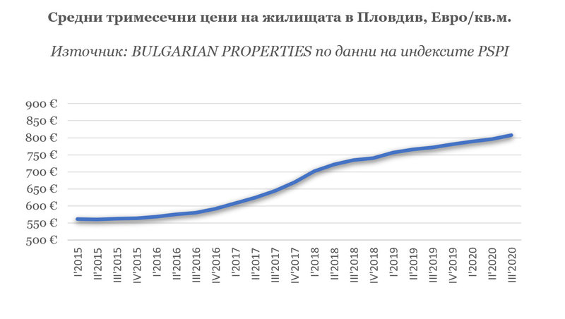 Данните ни сочат още, че за първи път през 3-тото тримесечие на 2020 г. средната цена на жилищата в Пловдив премина границата от 800 евро/кв.м. и достигна 808 евро/кв.м.
