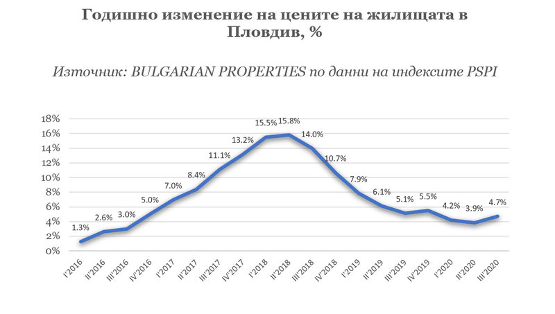 Пловдив беше лидер по нарастване на цените през изминалите години, като особено бърз темп на нарастване от близо 16% беше отчетен през 2018 г. След това темпът на растеж се забави и в началото на 2020 г. достигна до нива от около 3-4% на годишна база.