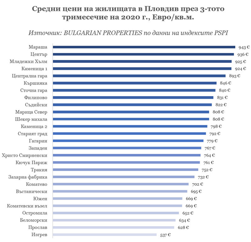 Най-скъпи квартали с цени над 900 евро/кв.м. са Мараша, Център, Младежки хълм, Каменица 1.