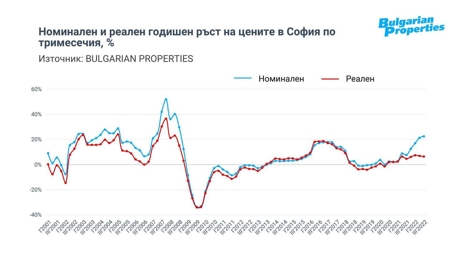 Така полученият реален ръст на цените на жилищата в София е 6.36% на годишна база. Това показва, че голямото нарастване през 2022 г. се дължи основно на високия темп на нарастване на общото ценово равнище, докато реалният растеж е много по-близо до очакваното развитие на пазара.