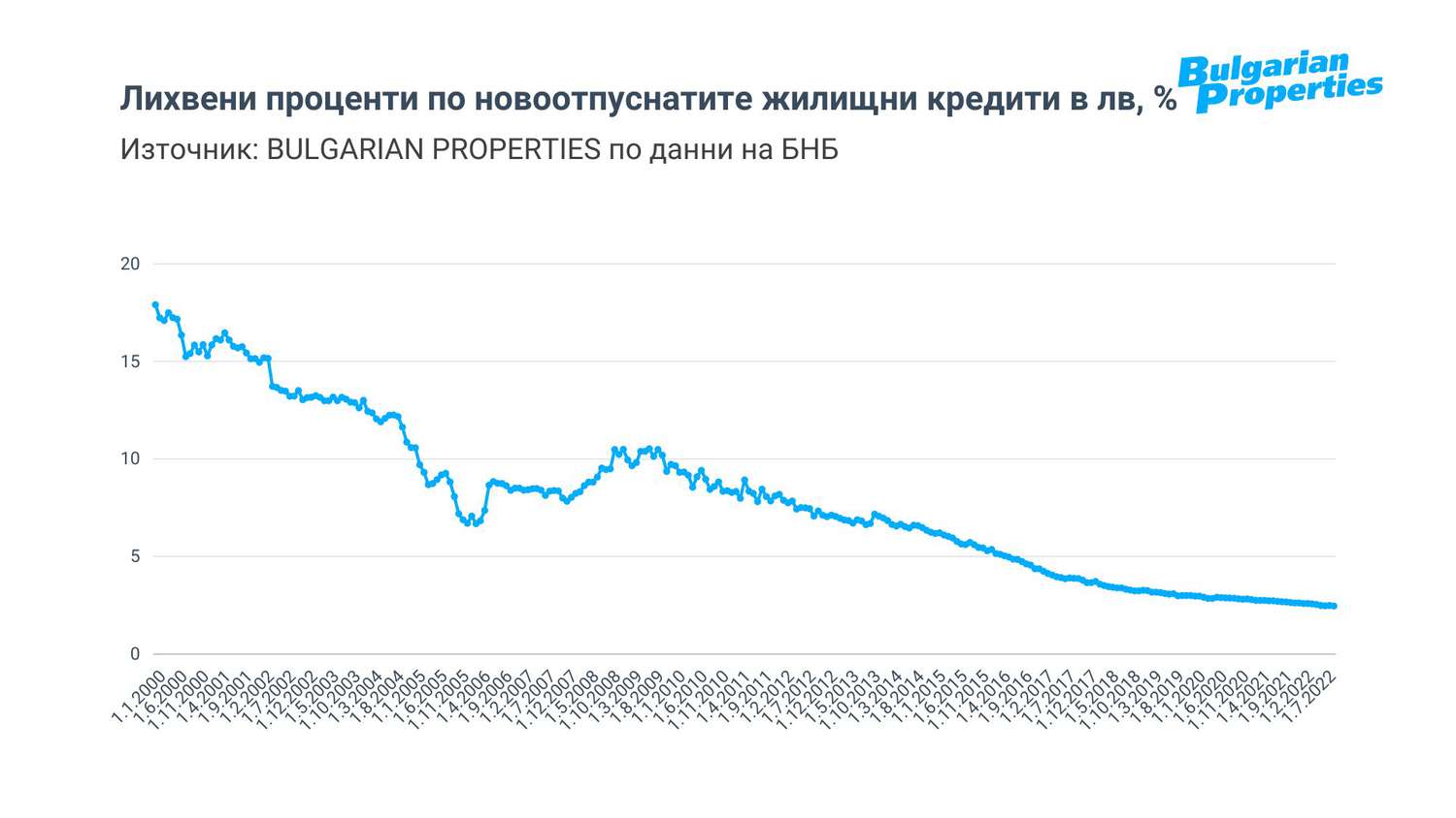 Лихвените проценти по жилищните кредити в лева, които са 97% от изтеглените жилищни кредити, продължиха да спадат и през третото тримесечие. Към месец септември те са на най-ниското си средно ниво - 2.46% по данни на БНБ.