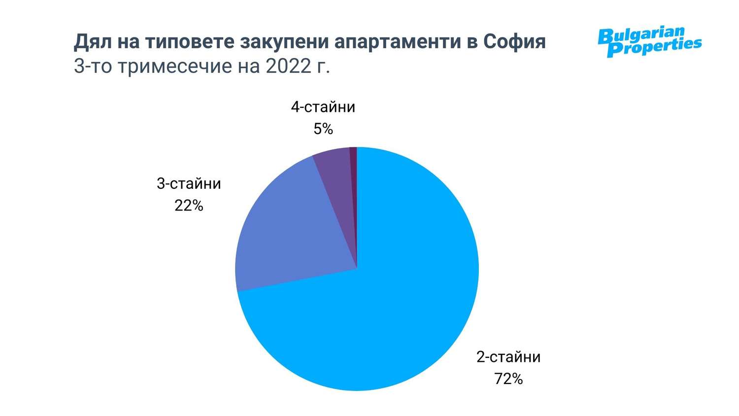 Делът на закупените двустайни апартаменти продължи да нараства през 3-тото тримесечие и достигна дял от 72% спрямо 50% през предходни периоди. Тристайните жилища съставляват само 22% от закупените, а четиристайните се върнаха на нива около 5%.