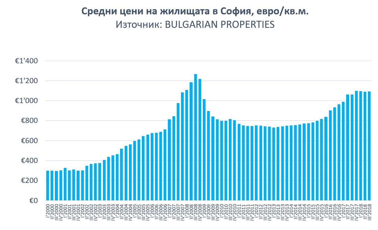 Данните на BULGARIAN PROPERTIES сочат, че през 2018 г. цените в София задържат достигнатите в края на 2017 година нива и остават без съществени изменения в 3-те поредни изминали тримесечия.