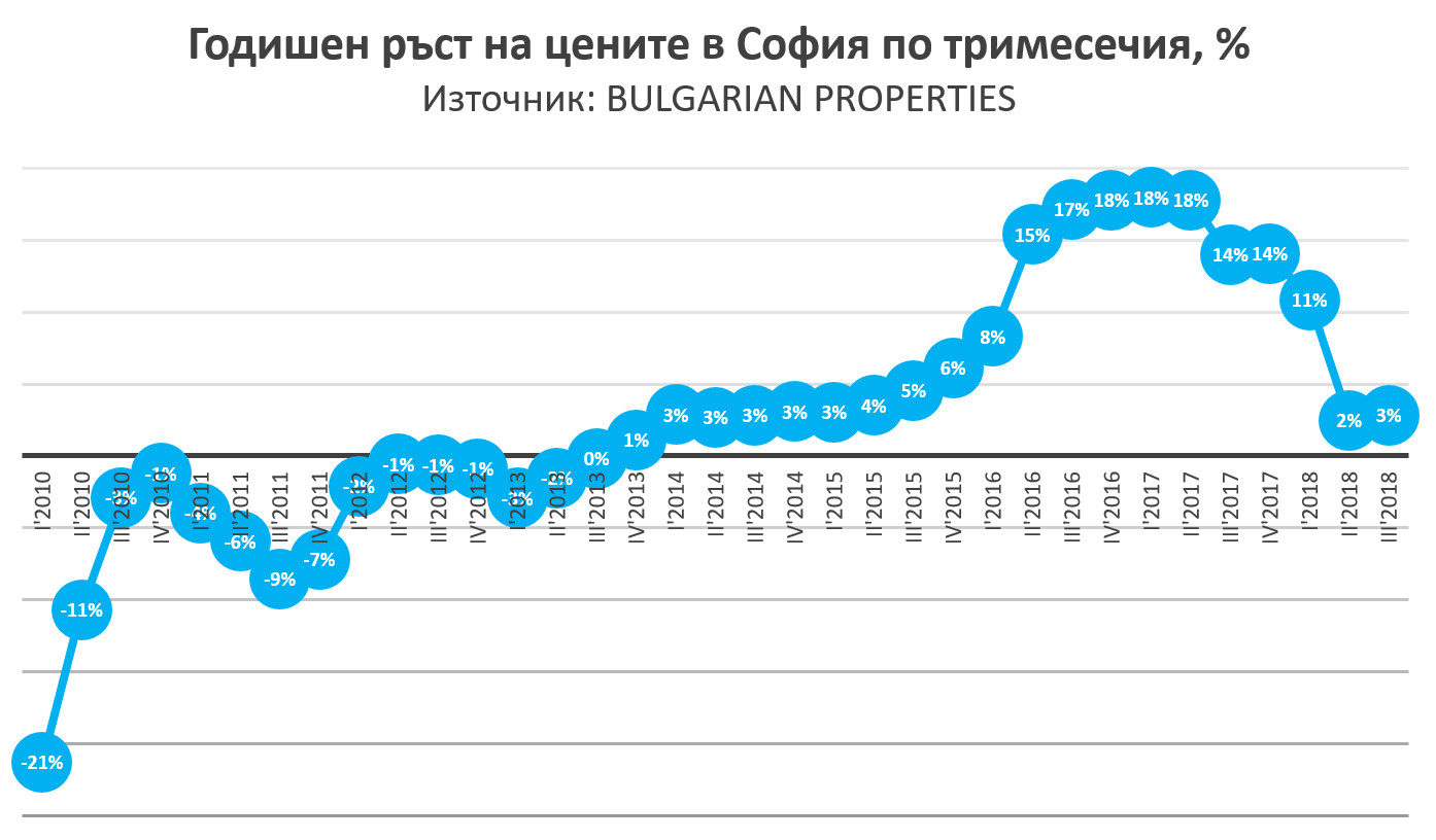 Така прогнозите ни от миналата година за забавяне на темпа на нарастване до около 10% и постепенно уравновесяване на пазара за момента се оправдават, като дори ръстът на цените през 2018 г. е под нашите очаквания.