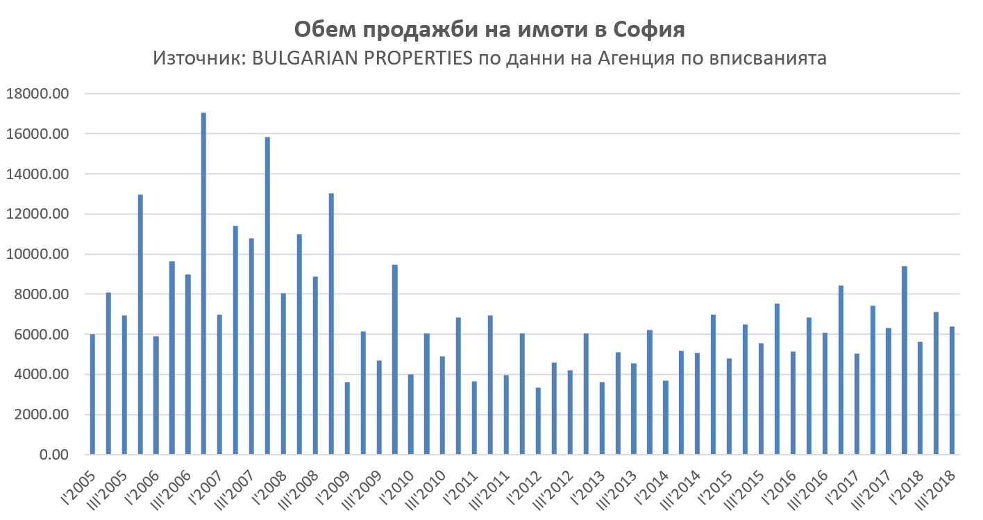 Според данните на Агенцията по вписванията за 3-тото тримесечие в София са вписани 6 376 имотни продажби при 6 300 за същия период на 2017 г., което е ръст само с 1.2% на годишна база. След увеличението на обема продажби до 6-8-10% сега изглежда, че и този показател се забавя.