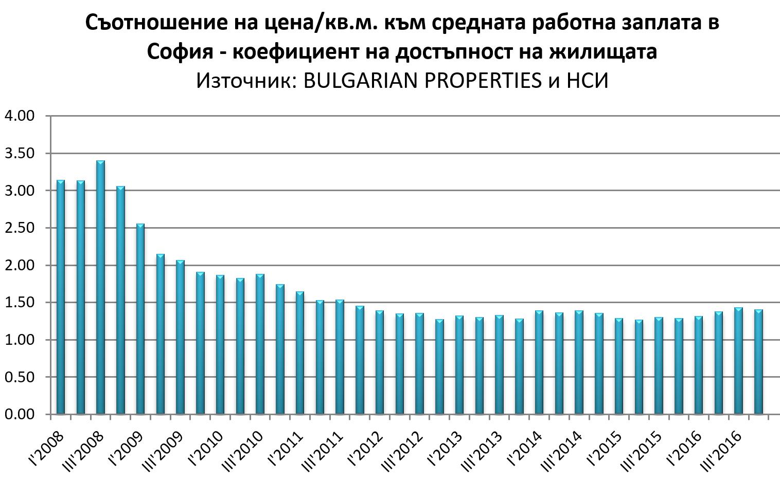 Икономиката расте и доходите се повишават - това са едни от най-важните фактори за ръст в цените на имотите. В София средната месечна работна заплата е вече над 1300 лв. към края на миналата година по данни на НСИ. Коефициентът на достъпност на жилищата (цена на имотите към средна заплата в София) се запазва на нива 1.3 – 1.4, в каквито рамки се движи от 2012 г. насам. Най-нисък този коефициент е бил през първото тримесечие на 2015 г. (1.29). Т.е. имотите са били най-достъпни в началото на 2015 г., но и към момента коефициентът не е много променен.
