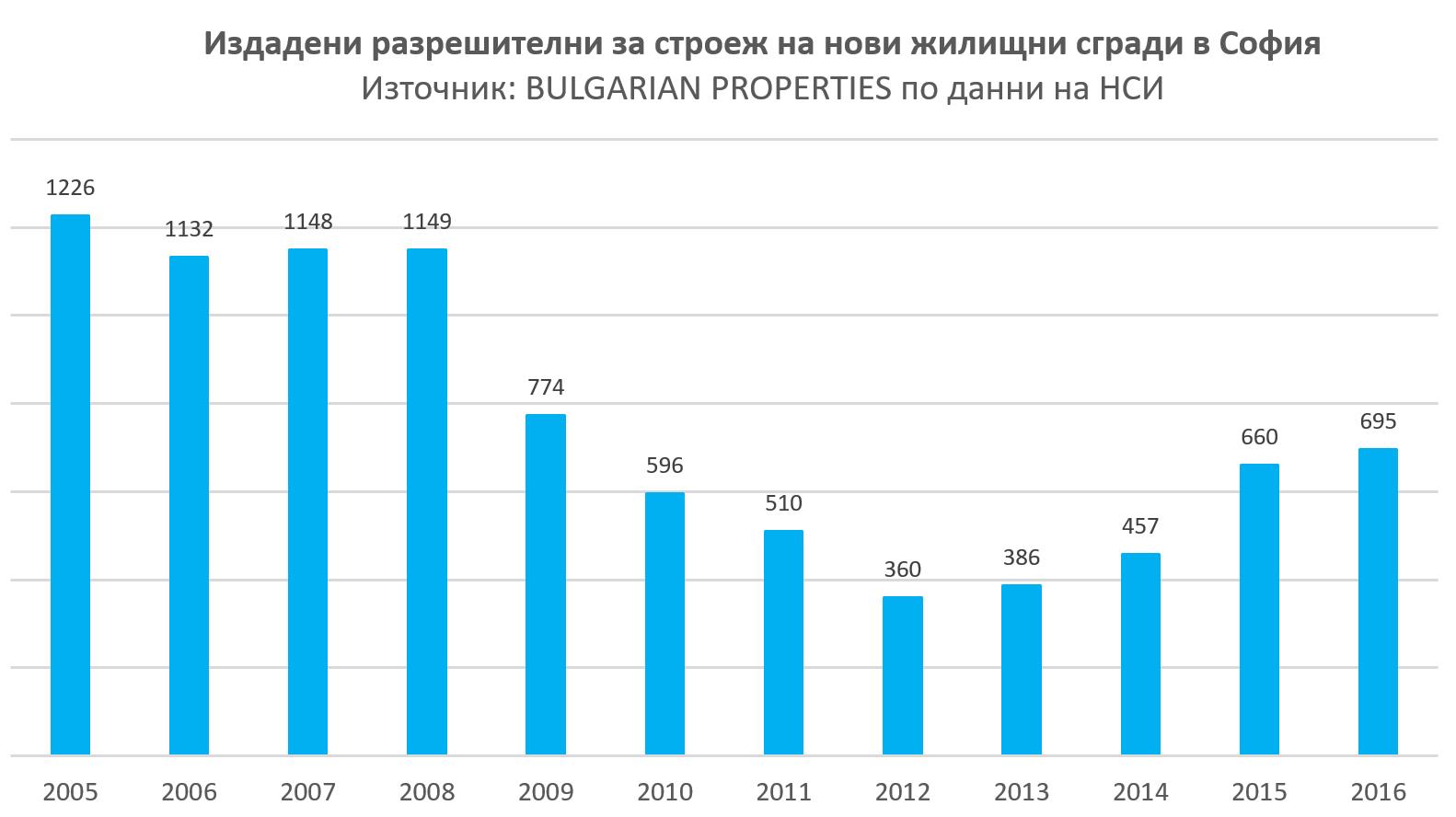 Издадените разрешителни за строеж на нови сгради са един от индикаторите, които показват в каква посока ще се дижи предлагането и са важен показател за настроенията и перспективите за пазара като цяло. За 2016 г. в София са издадени около 700 разрешителни за строеж, като се увеличават с около 5% спрямо година по-рано. Това е около 60% от пиковите нива при предния бум, когато са били издавани по около 1 100 – 1 200 разрешителни за строеж на нови жилищни сгради в София на година.