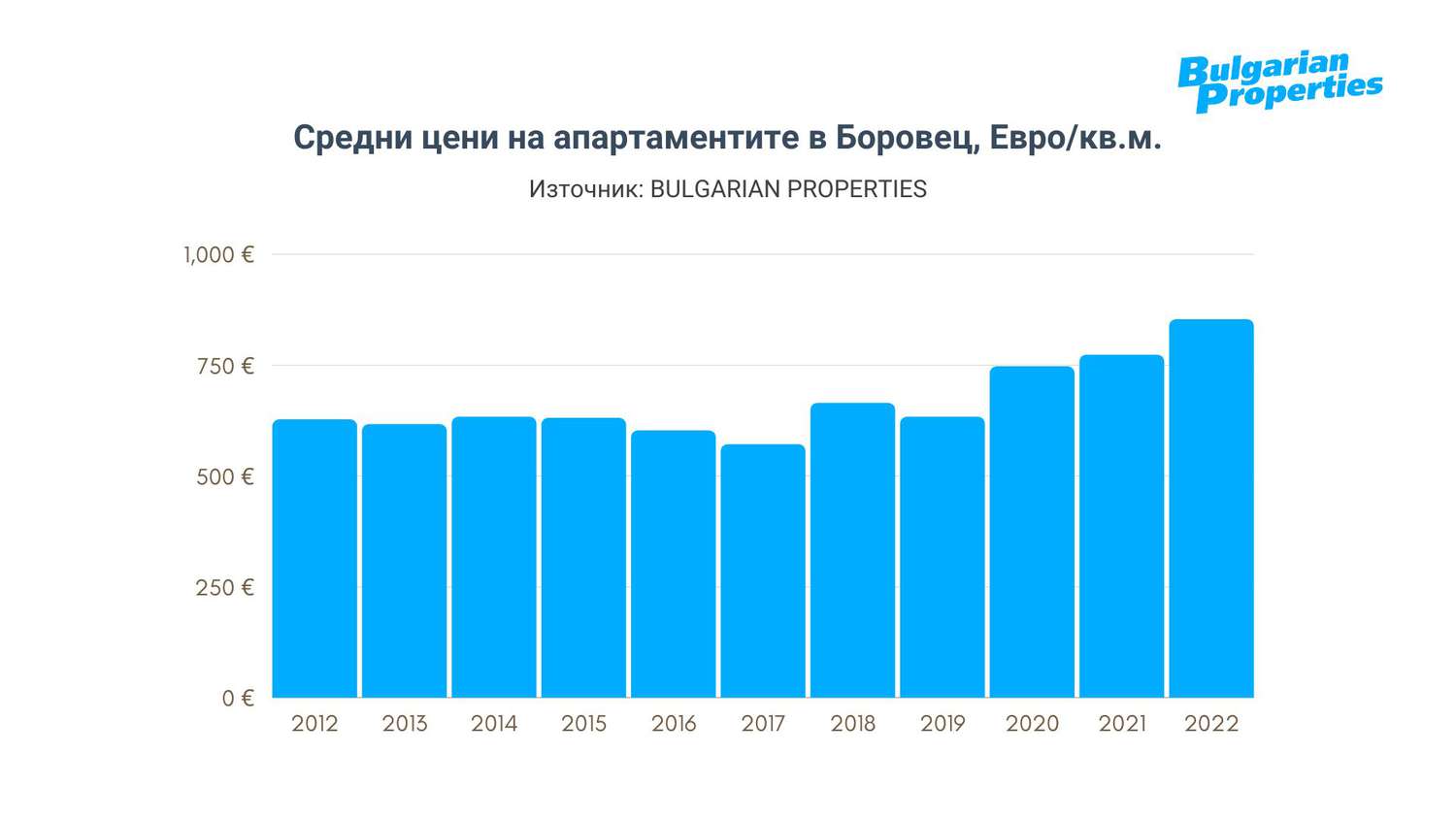 Данните на BULGARIAN PROPERTIES сочат, че Боровец е най-скъп, но и най-предпочитан сред планинските курорти. Средната цена там за 2022 г. е 850 евро/кв.м. (спрямо 770 евро/кв.м. година по-рано). През последното тримесечие на 2022 г. бяха достигнати най-високите нива – 960 евро/кв.м., което представлява 26% ръст на годишна база. Средната покупна цена на апартаментите в Боровец е нараснала от 48 300 евро през 2021 г. до 60 500 евро през 2022 г. През последното тримесечие на 2022 г. средната цена на закупените жилища в курорта достигна върхови нива от почти 68 000 евро.