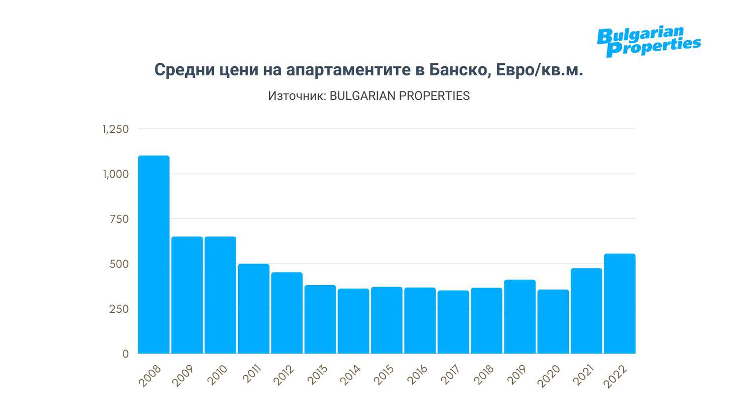 Средната цена на имотите в Банско за 2022 г. е 555 евро/кв.м., като през последното тримесечие на годината BULGARIAN PROPERTIES отчита средна цена 685 евро/кв.м. Средната цена на закупените апартаменти достигна близо 50 000 евро. Това са най-високите цени от 2010 г. насам.