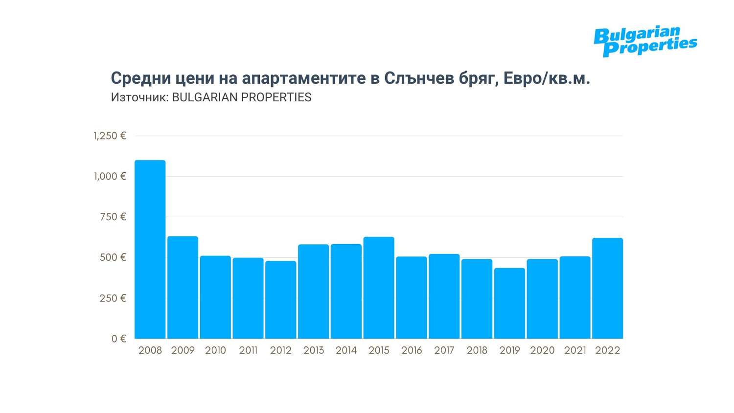 Средната цена в Слънчев бряг на база реални сделки по данни на BULGARIAN PROPERTIES е достигнала 620 евро/кв.м. през 2022 г. Това са нива, каквито не сме имали от времето на руския бум през 2013-2014 г. Ръстът е с около 115 евро/кв.м. или с 22% спрямо година по-рано.
