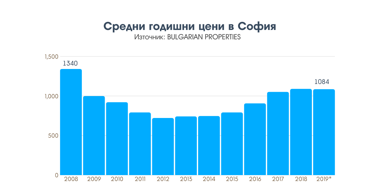 Средната цена на квадратен метър в столицата е около 1090 евро на кв. м. и е доста под постигнатите нива в бума през 2008 г., когато измерихме средна цена 1340 евро/кв.м.