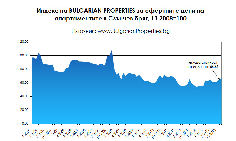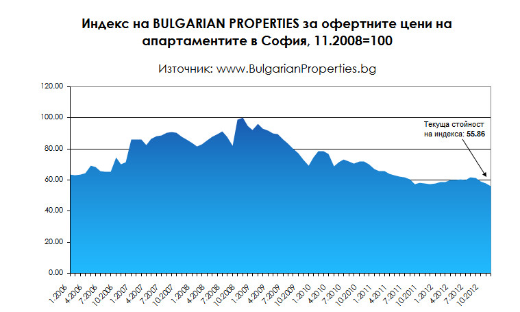 Индексът на BULGARIAN PROPERTIES за офертните цени на апартаментите в София за декември 2012 г. е 55.86 процентни пункта. Средната месечна офертна цена на апартаментите в столицата е 835 Евро/кв.м. Средното понижение на офертните цени на апартаментите в София е -4% на годишна база.