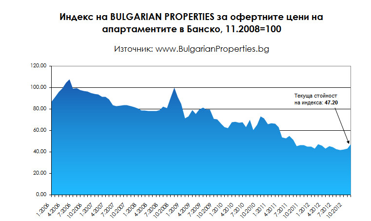 Индексът на BULGARIAN PROPERTIES за офертните цени на апартаментите в Банско за декември 2012 г. е 47.20 процентни пункта. Средната месечна офертна цена на апартаментите в най-големия ни ски курорт е 604 Евро/кв.м. Средният годишен спад на офертните цени на апартаментите в Банско е -19,25%.