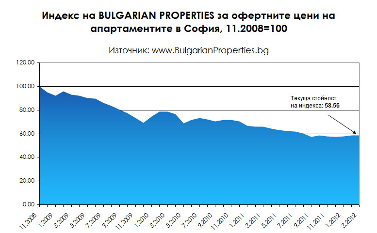 Индексът на BULGARIAN PROPERTIES за офертните цени на апартаментите в София за март 2012 г. е 58.56 пункта. Средната месечна офертна цена на апартаментите в столицата е 875 Евро/кв.м. Сделки се сключват на средна цена от 735 Евро/кв.м. през първото тримесечие на 2012 г.