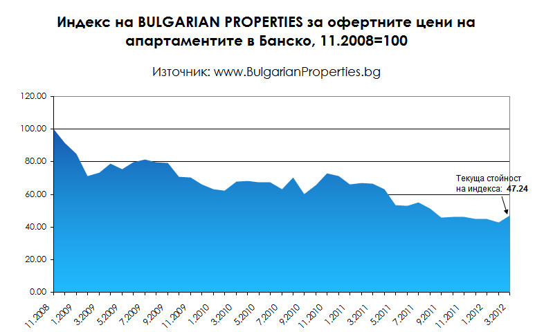 Индексът на BULGARIAN PROPERTIES за офертните цени на апартаментите в Банско за март 2012 г. е 47.24 пункта. Средната месечна офертна цена на апартаментите в най-големия ни ски курорт е 605 Евро/кв.м. Сделки се сключват на средна цена от 465 Евро/кв.м. през първото тримесечие на 2012 г.