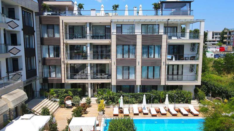 Стилно обзаведен двустаен апартамент в луксозна бутикова сграда от затворен тип, която се намира на първа линия в централната част на град Приморско, пред Южния плаж, само 2 минути пеш до централния площад и всички удобства.