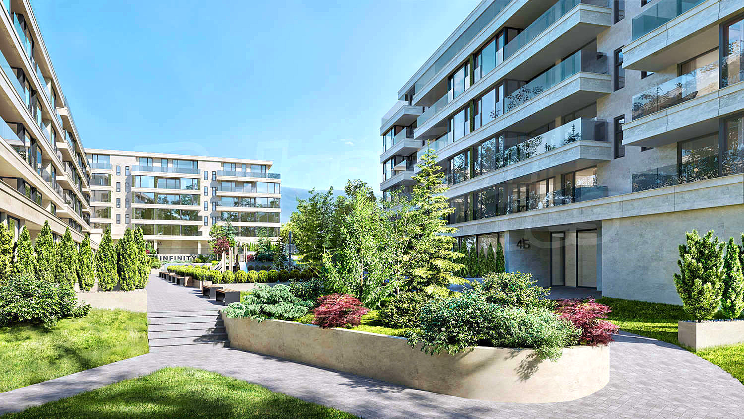 Вътрешните дворни пространства са проектирани като истински зелен оазис с красива градина, ефектни фонтани и места за релакс, разходки и спорт – джогинг пътеки и детска площадка създават комфортна и спокойна среда за цялото семейство. Комплексът предлага не само простор, но и сигурност – с ограден периметър и контролиран достъп.