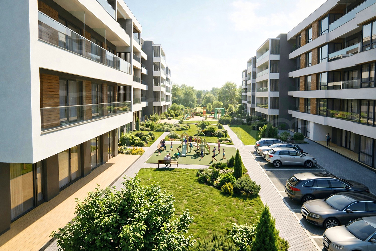 Общата концепция на проекта включва зони за отдих, детска площадка, открит фитнес, както и озеленени пространства, създаващи приятна и спокойна жилищна среда. Паркирането е решено чрез надземни и подземни паркоместа, както и подземни гаражи, което гарантира удобство за всички собственици и гости.