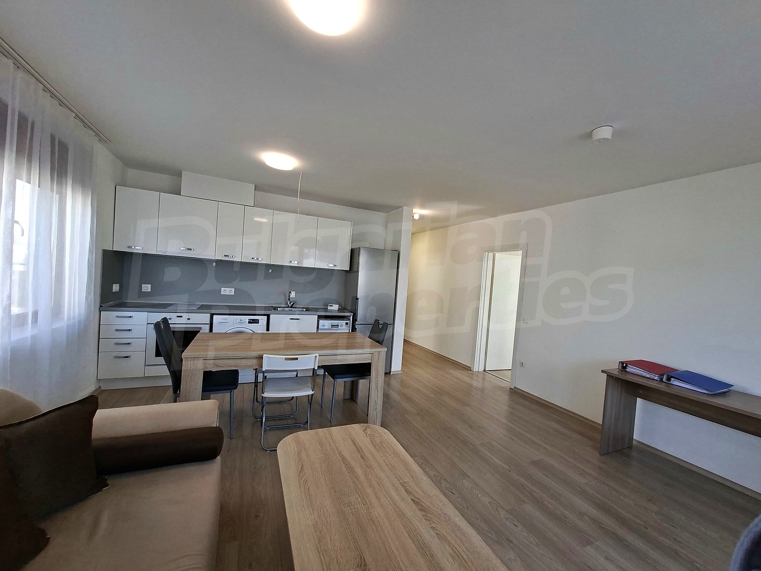 • впечатляваща дневна с кухненски бокс и френски прозорци