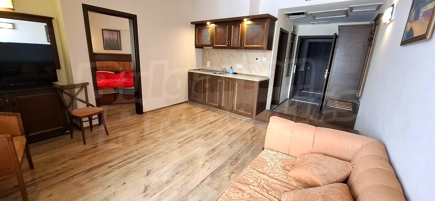 Апартаментът е обзаведен с бутикови мебели от естествен дървен материал, лакирани в цвят махагон. Таксата за поддръжка включва ползването на СПА съоръженията от новите собственици.