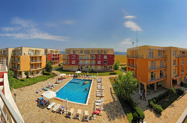 • балкон с излаз от двете стаи и гледка към вътрешността на комплекса и добре поддържани басейн