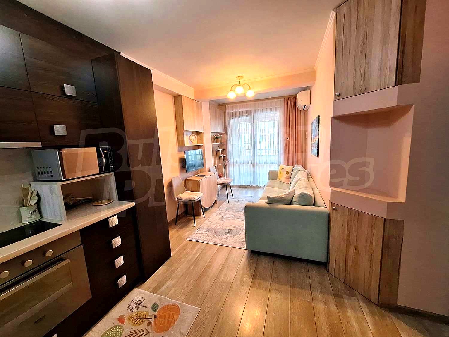 Имотът е напълно обзаведен. В дневната има климатик, триместен разтегателен диван, помощна масичка, плосък TV, в кухненската част - ел. фурна, котлони, абсорбатор, хладилник, пералня, сушилня; спалня - вграден гардероб, двойно легло, етажерка.