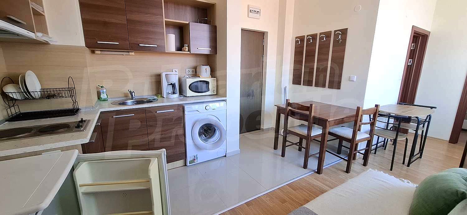 • Кухня с трапезария – напълно оборудвана с вградени електроуреди: котлони, абсорбатор, хладилник, пералня, микровълнова фурна, кафемашина, както и маса за хранене с два стола и разтегателен диван, подходящ за гости.