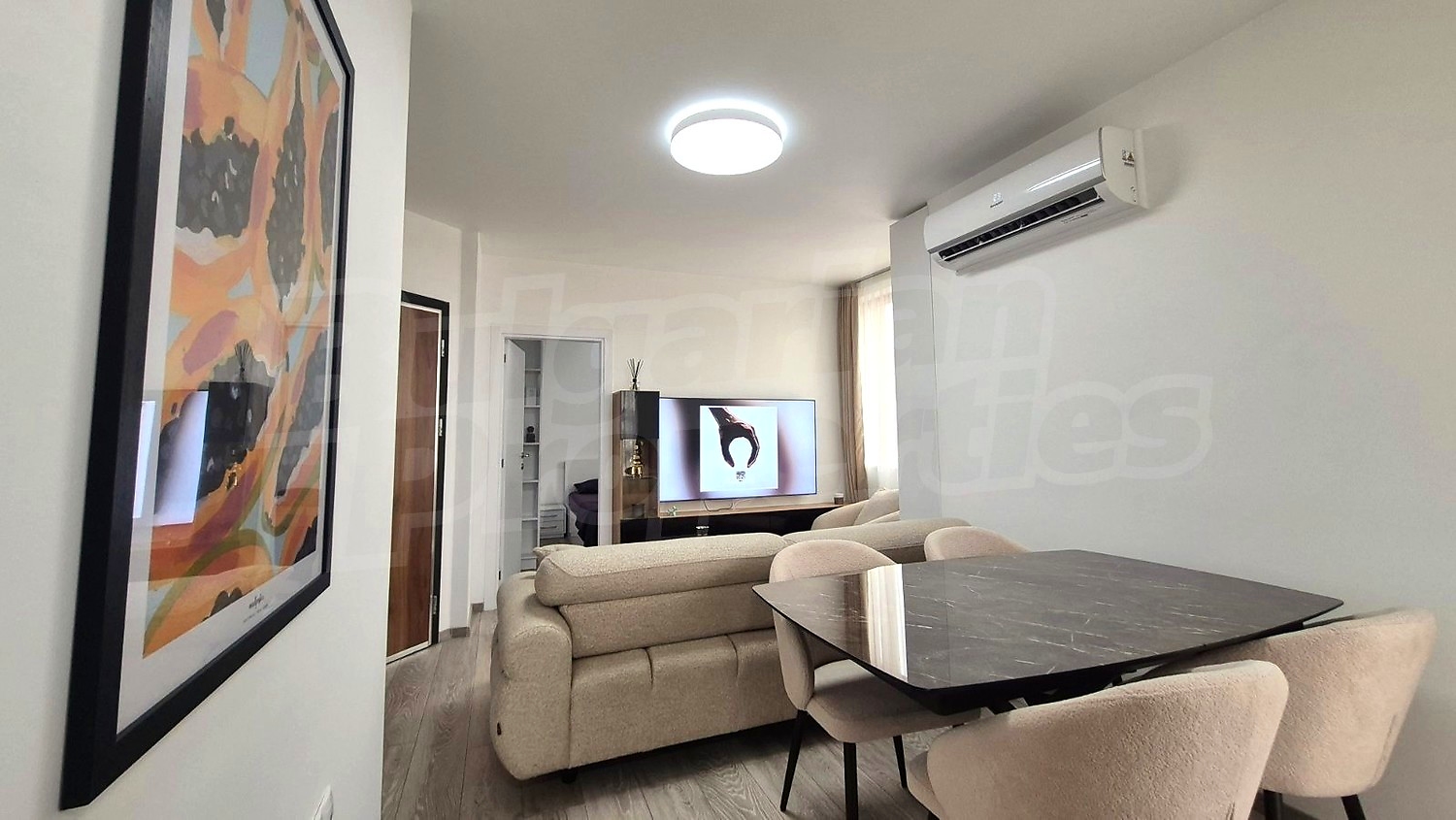 Апартаментът се състои от светла дневна с кухненски бокс и трапезария, уютна спалня и баня с тоалетна. Предлага се напълно обзаведен и оборудван с висок клас мебели и електроуреди, като всеки детайл е подбран с вкус и внимание към комфорта на бъдещите собственици. Интериорът е издържан в модерен, минималистичен стил, с качествени настилки, осветление и декоративни акценти, които създават усещане за топлина и завършеност.