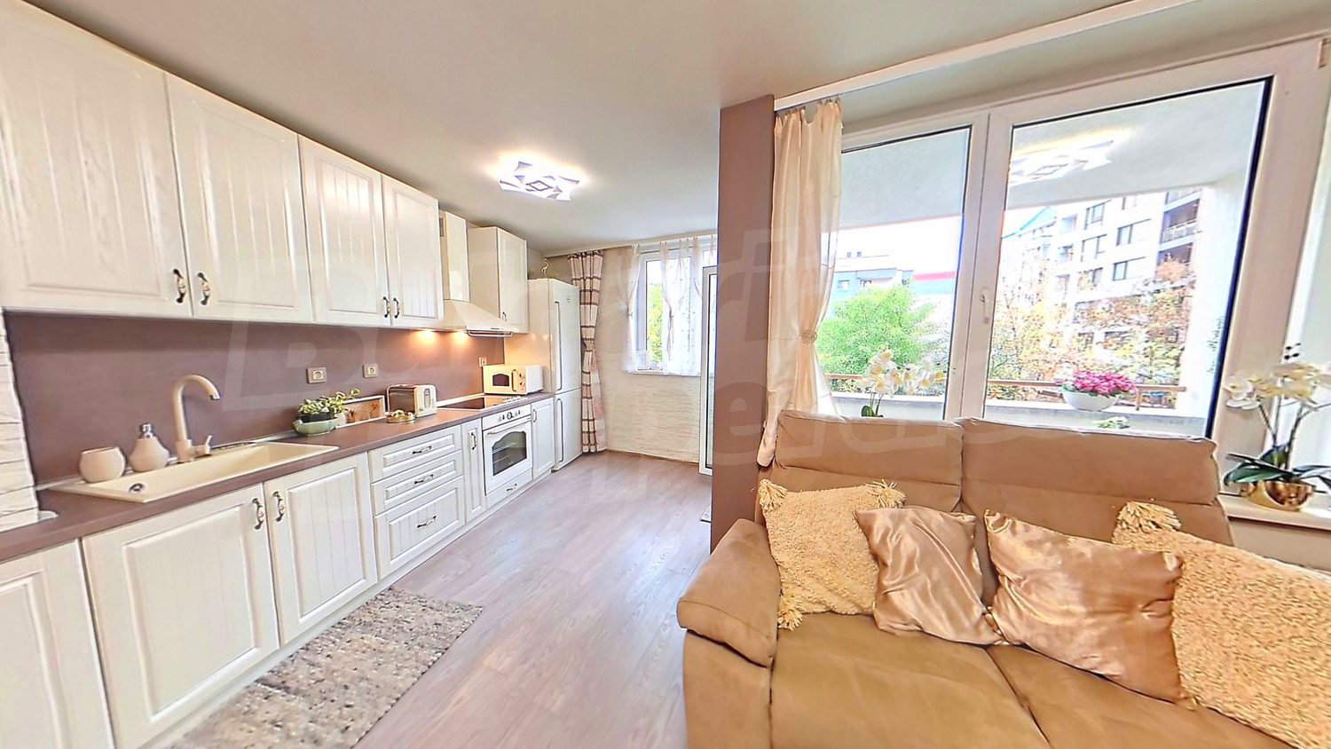 Жилището е напълно обзаведено с чисто нови мебели и висок клас уреди: кухня от МДФ с механизми Blum, уреди Gorenje ретро серия – фурна, котлони, хладилник, абсорбатор, тостер, микровълнова и електрическа кана.