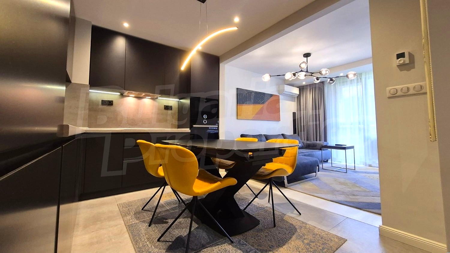 Апартаментът се предлага напълно обзаведен и оборудван, готов за нанасяне. Кухнята е поръчкова, с вградени електроуреди Bosch – фурна, керамичен плот, абсорбатор, миялна и пералня със сушилня. Мебелите са изработени по поръчка от висококачествен MDF, а интериорът е завършен с гипсокартон и димеруемо осветление, създаващо уютна атмосфера и възможност за различно настроение според времето на деня.