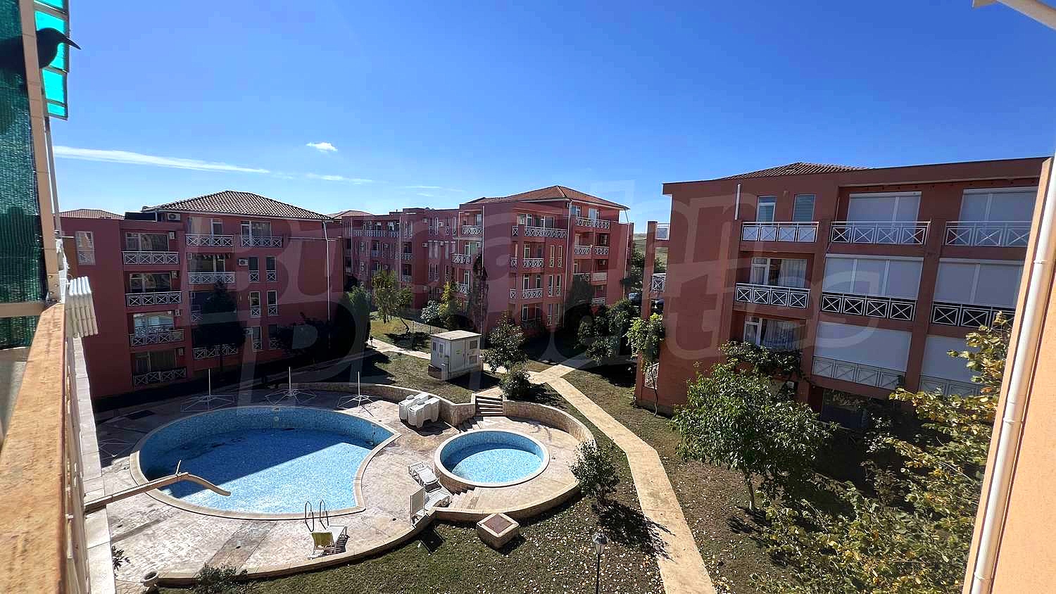 Студиото (25.07 кв.м.) се намира на 3-ти етаж с гледка към басейн в комплекса. Пълното обзавеждане и оборудване може да разгледате във фото галерията.