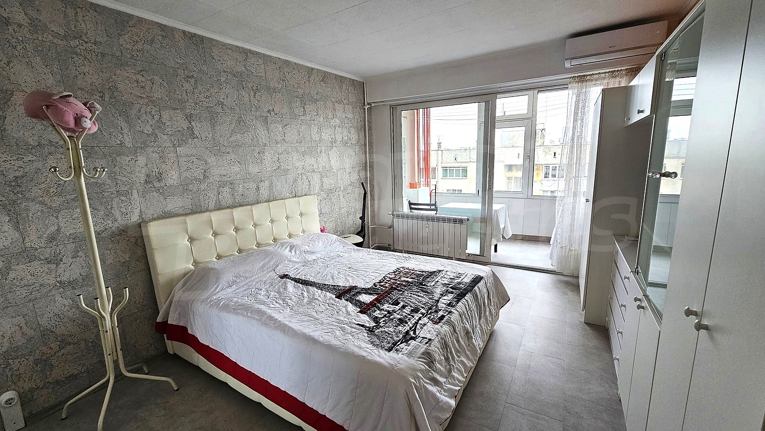 Спалнята е създадена като истинско пространство за релакс – с куин сайз легло, голям вграден гардероб с плъзгащи врати и стилна секция с телевизор и климатик, изпълнени по индивидуален проект. На остъкления балкон е обособено практично пространство със сушилня.