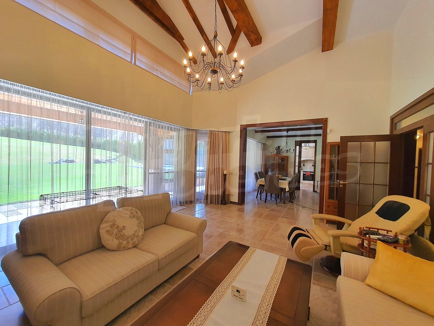 • Първи етаж: просторна дневна, кухня, трапезария с камина, основна спалня, гардеробно помещение, баня с тоалетна, две самостоятелни спални, две бани с тоалетни, мокро помещение.