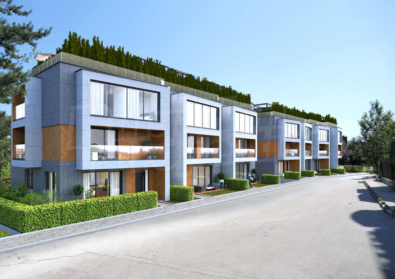 Предвидена е добре аранжирана и богато озеленена вертикална планировка на всеки двор, като това ще добави усещане за частност и допълнителна уединеност на имотите. Разположението на терена предполага прекрасна гледка (която няма да бъде скрита за в бъдеще) към града от горните етажи и покривната тераса.