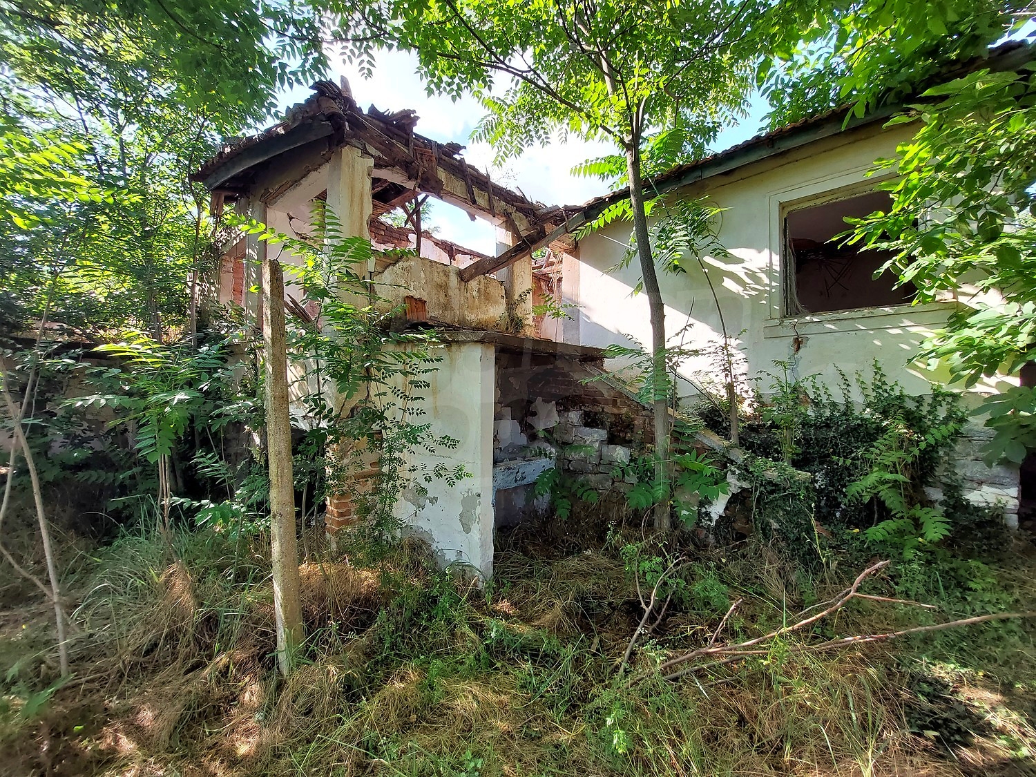 В границите на имота има почти паднала къща (60 кв.м.), но със здрави каменни основи, които могат да бъдат използвани за построяването на нова такава. Намира се на неасфалтов път, заемаща място на две улици, тъй като е точно на самия ъгъл. В двора има кладенец.
