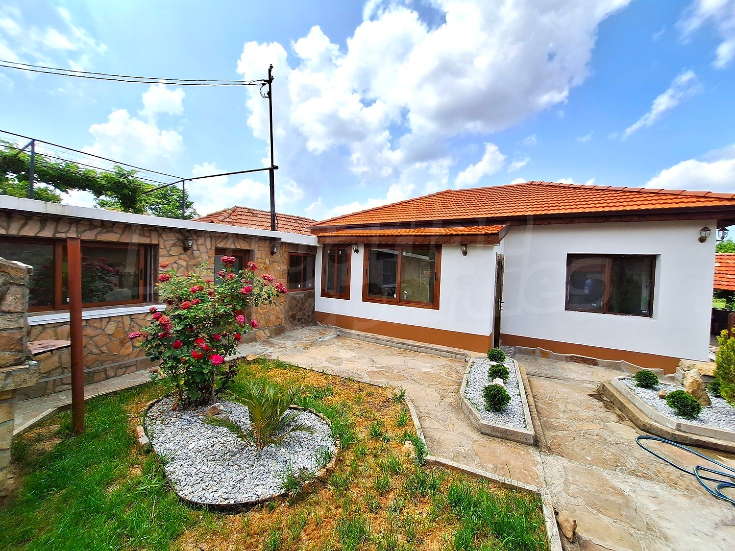 Имотът е с площ 1250 кв.м. и включва едноетажна, напълно реновирана къща с площ за живеене (130 кв.м.). Жилището се състои от: