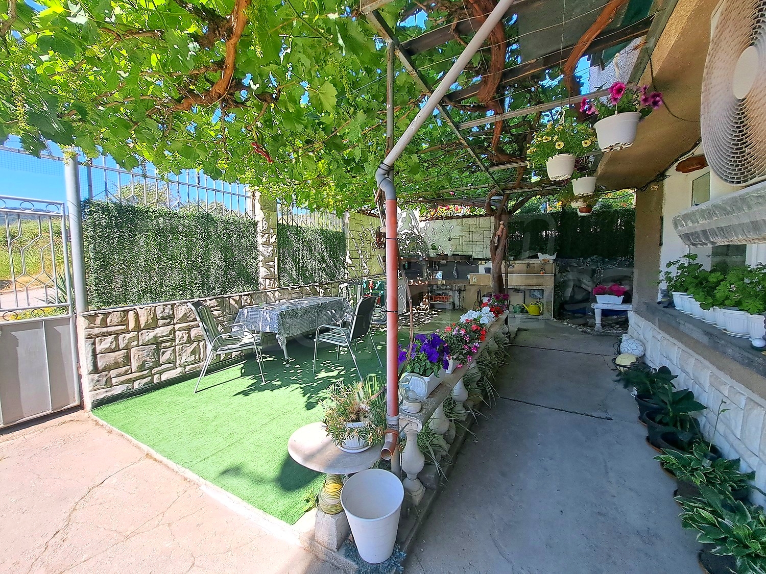 Добре поддържаната тухлена къща (360 кв.м.) предлага комфортна жилищна площ и разполага с шест спални и три бани - подходящ избор за по-големи семейства или за тези, които ценят допълнителното пространство. Година на строителство: 1985. Отоплението се осигурява от камина и климатици за целогодишен комфорт. Интериорът е с изчистен вид, като включва подова настилка от плочки и боядисани стени. Имотът е оборудван с UPVC дограма на първи етаж, осигуряваща добра изолация и енергийна ефективност и дървена дограма на останалите етажи.