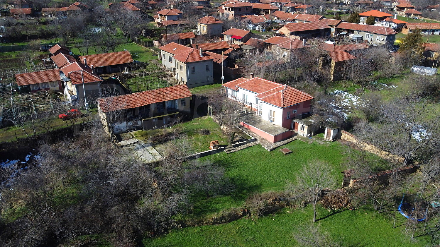 Парцелът е с площ от 1 декар и предлага просторно и хармонично пространство за живот и почивка. В центъра му се намира едноетажна къща от 75 кв. м., разширена с пристройка от 18 кв. м., превърната в светъл и просторен хол – естествено продължение на всекидневната и кухнята. В имота има и запазена плевня, която добавя характер и възможности за бъдещи идеи.