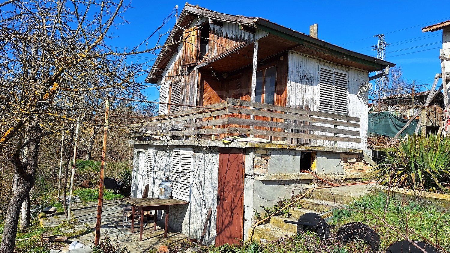 Имотът включва тухлена вила с площ от 30 кв.м, построена през 1996 г., с изградена плоча и допълнително надстроен мансарден етаж от дърво. Мансардният етаж се нуждае от основен ремонт или премахване, което дава възможност за преустройство и надграждане според нуждите на новия собственик. Жилището се състои от една стая и малка кухня.