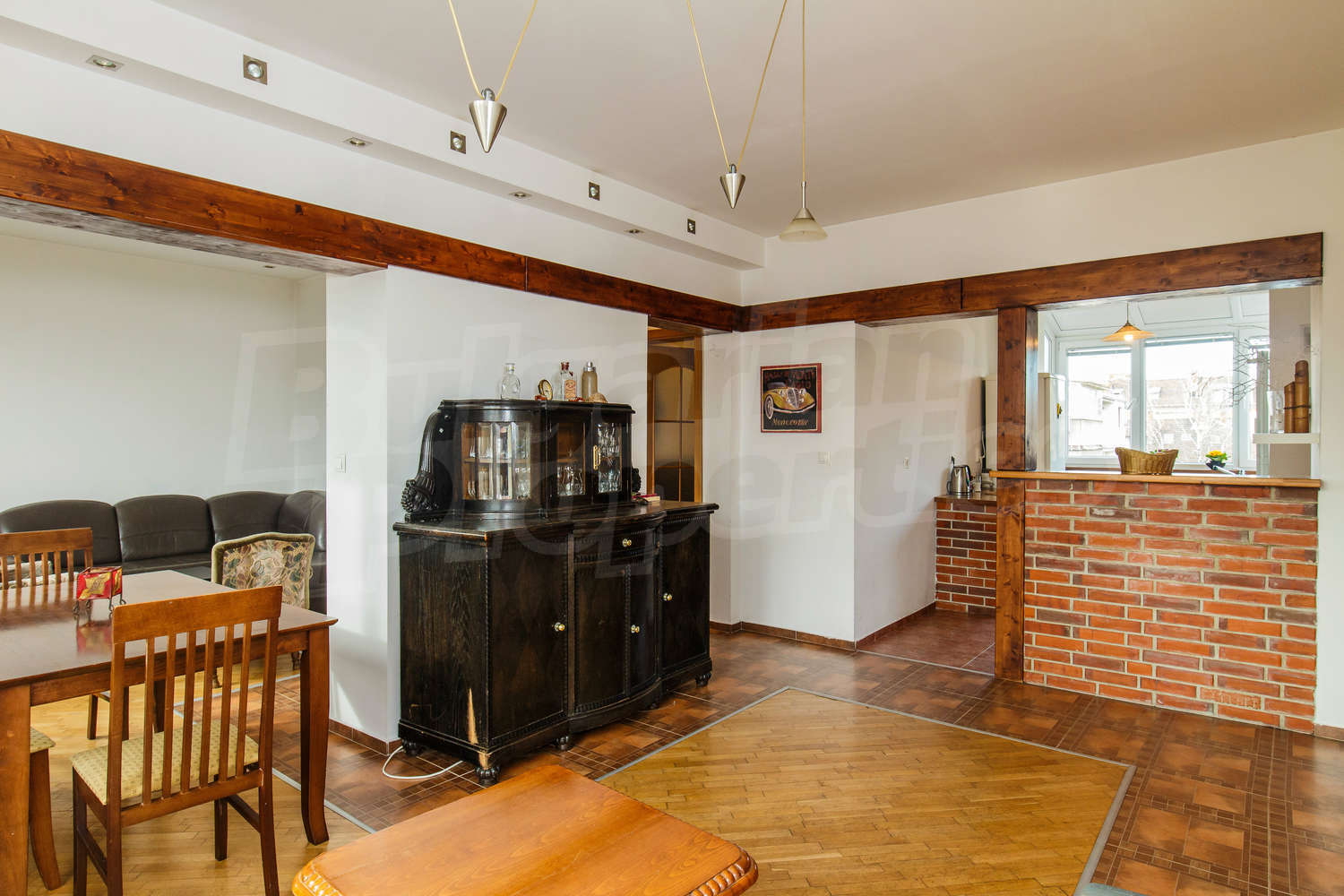 • стени: латекс, тухлени облицовки, масивни дървени греди в дневната